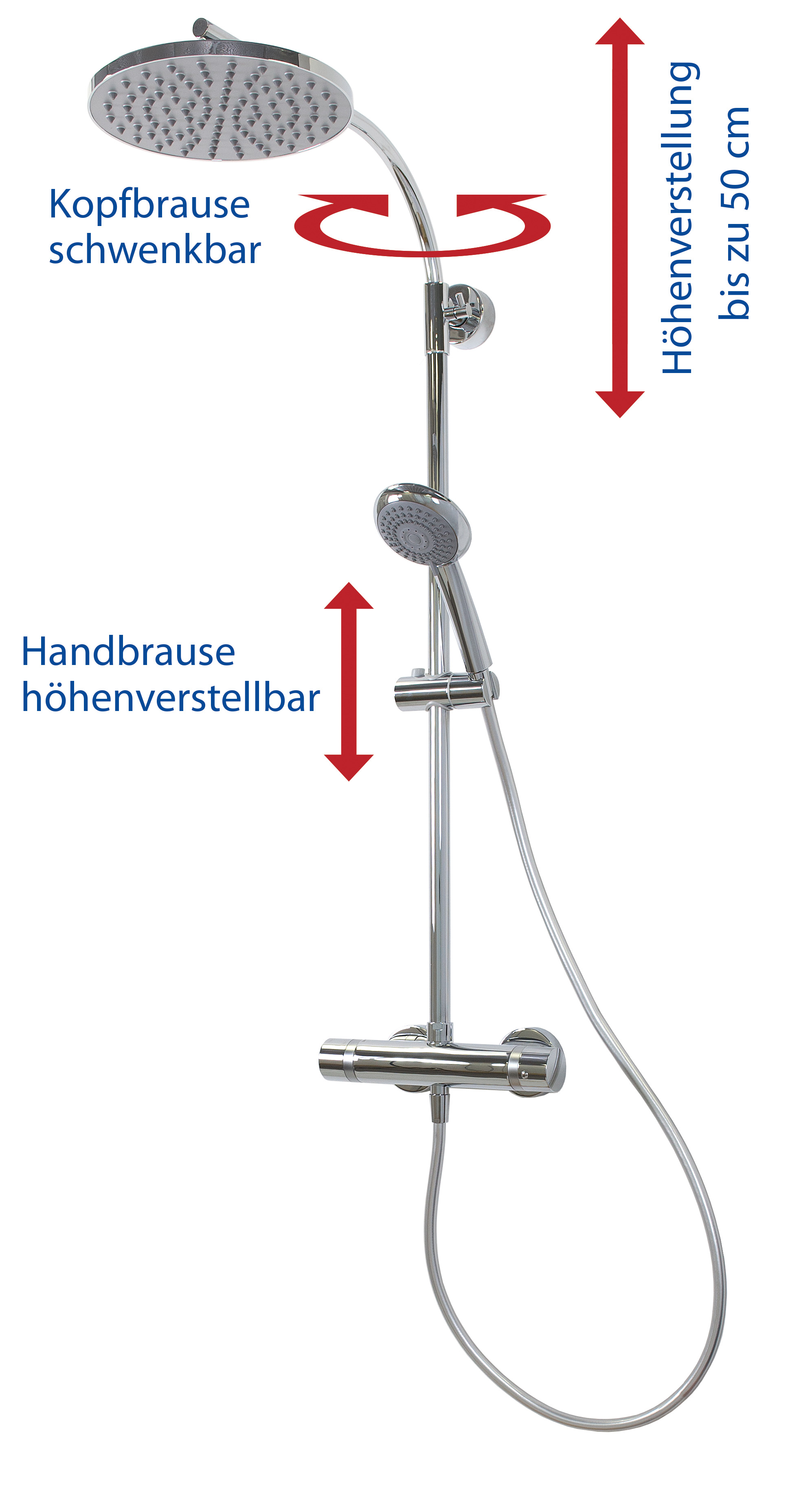 - maximaler Duschkomfort auch bei niedrigen Deckenhöhen durch Verstellung bis zu 500 mm