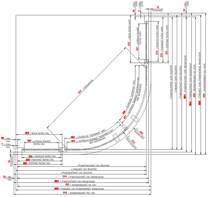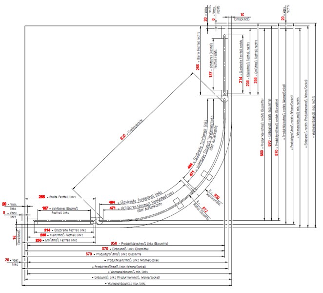 | Maß | Produktmaß li. | Produktmaß re. | Wanneneinbaumaß li. | Wanneneinbaumaß re. | Fliesenmaß li. | Fliesenmaß re. | Einstiegsbreite | Höhe + 35mm Stabilisator |