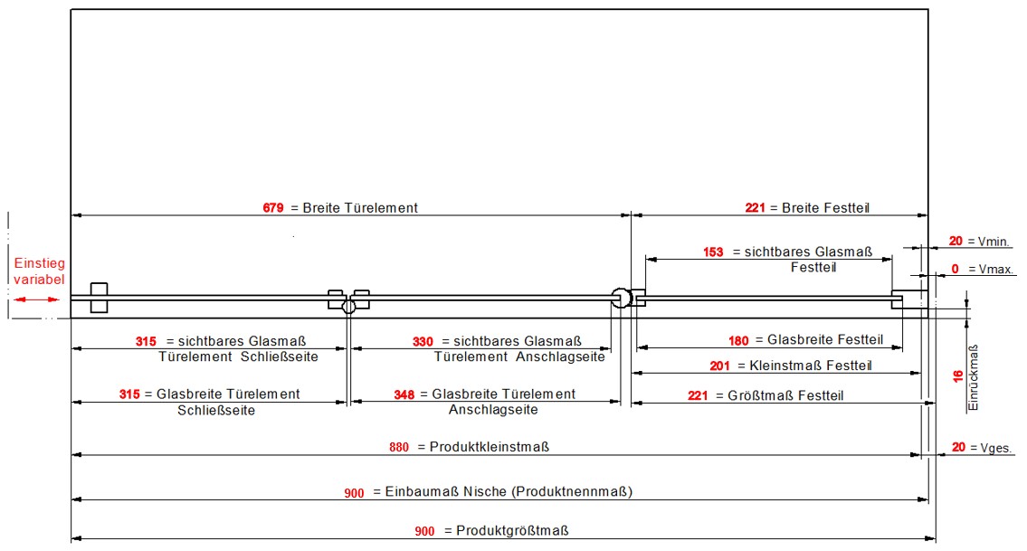 | Ausführung | Produktmaß | Wanneneinbaumaß | Festteilbreite | Einstiegsbreite | Höhe |