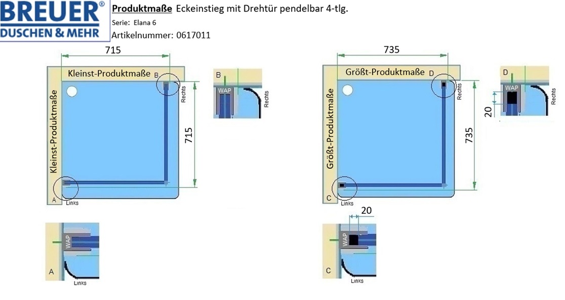 | Ausführung | Produktmaß li. | Produktmaß re. | Wanneneinbaumaß li. | Wanneneinbaumaß re. | Fließenmaß (Glasmitte auf Fuge) li. | Fließenmaß (Glasmitte auf Fuge) re. | Einstiegsbreite | Höhe zzgl. 35 mm Stabilisator |