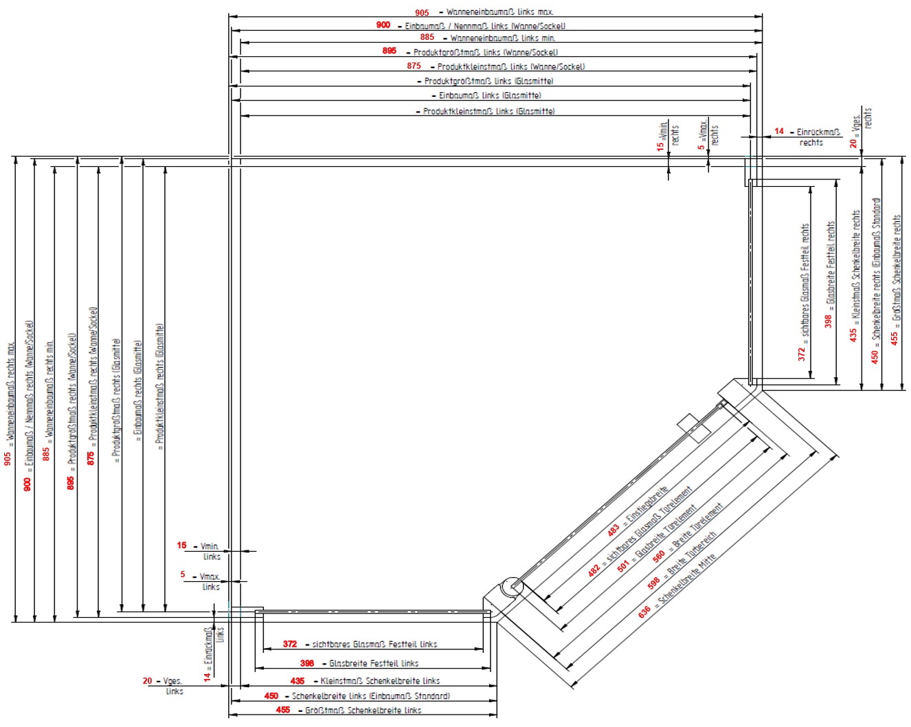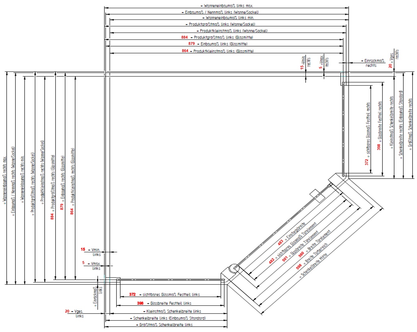 Einstiegsbreite | Fliesenmaß (Glasmitte auf Fuge) mit Festteil / ohne Festteil |