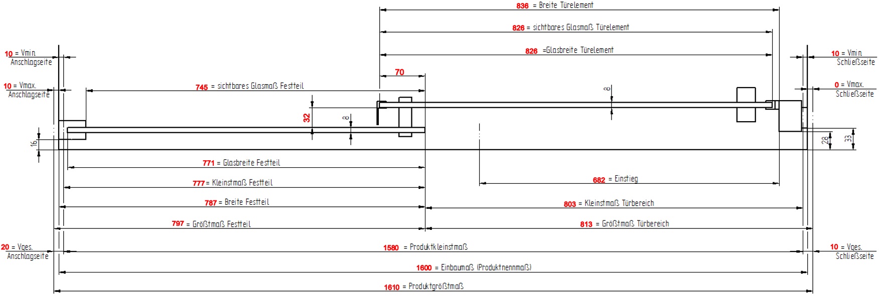 Bitte beachten Sie: Um die Verstellmöglichkeit zu gewährleisten, besteht zwischen Wandanschlussprofil und Beginn der Laufschiene ein Spalt von 15 mm. Dieser Spalt / Abstand wird ab einem Maß von 1.600 mm größer, da hier die maximale Länge der Laufschiene erreicht wird.